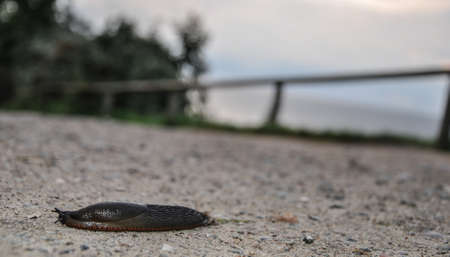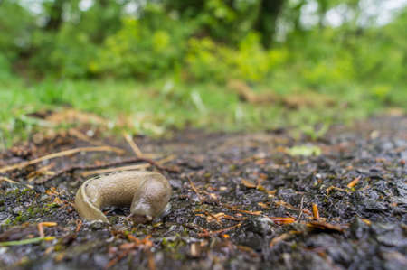 Snaile without a shell on the dirt-track in macro close-up blurred background