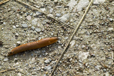 Brown slug moving slowly on ground after the rain, antenna up