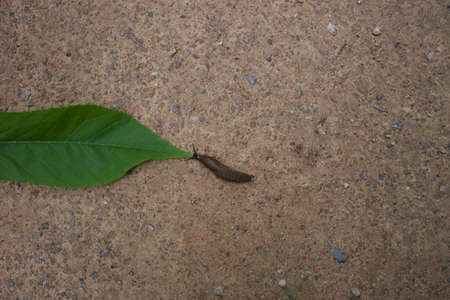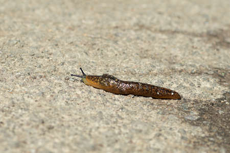 The slug crawls on the concrete surface and lets goo