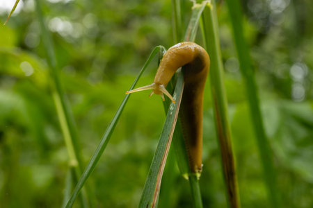 Slug animal on grass stem with blurred background. Macro photo