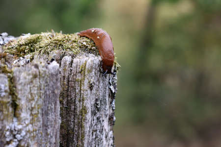 Close up view of common brown Spanish slug on wooden log outside. Big slimy brown snail slugs crawling in the garden