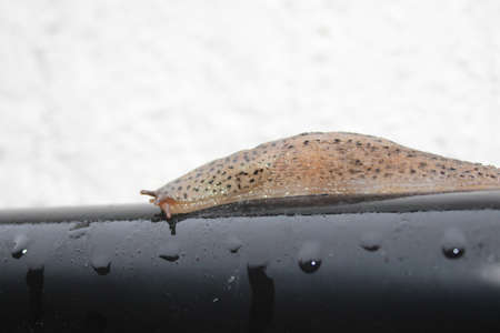 Spanish slug moves slowly on agrofibre. Agricultural pest threat crops, consume vegetation. Creeping invasive molluscs. High quality photo.