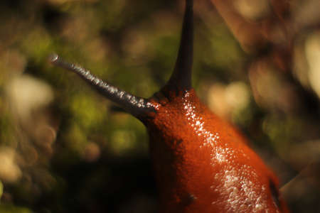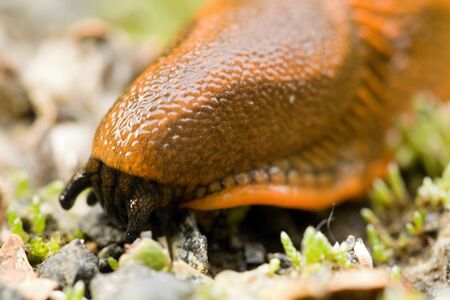 surface perspective of a creeping orange slug on stony ground