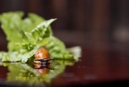 A slug crawling on a green leaf salad