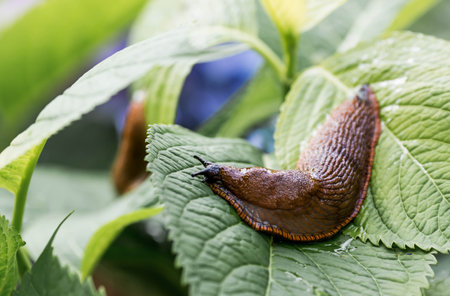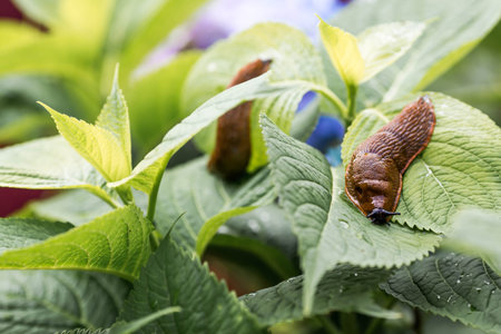 Slugs crawling over vegetation in the garden