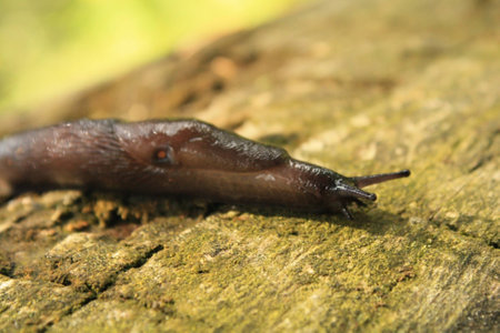 Snail without shell. Brown spotted slug with upper optical and lower sensory tentacles crawling on wooden snag in garden. Close up of wet, slippery arthropod. Garden pest. Natural wildlife background.