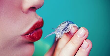 Snail closeup portrait. Little snail in shell crawling on green leaf in garden. Inspirational natural spring or summer background. Life of insect. Macro close up