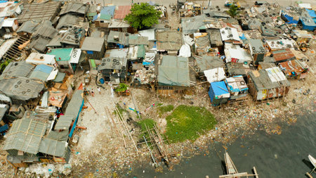 Slums with shacks of local residents and the river bank littered with garbage from above. Manila, Philippines.
