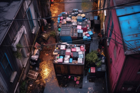 aerial view of overfilled dumpster in an alley, created with generative ai