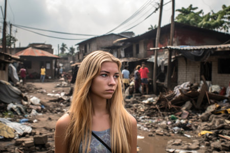 a young woman standing in a devastated neighbourhood, created with generative ai