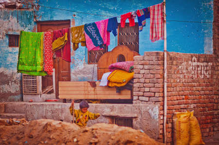 Poor indian house with colorful clothes hanging