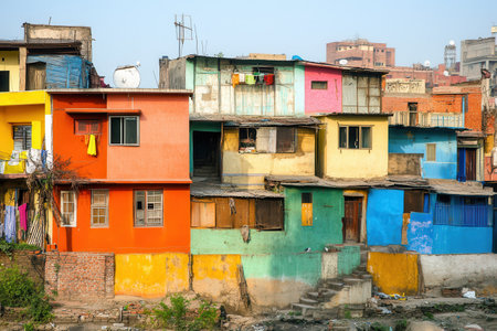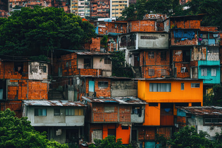 Colorful homes stand next to dilapidated shanties, emphasizing the stark contrast of wealth and poverty in an urban area.