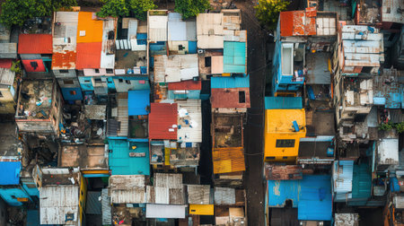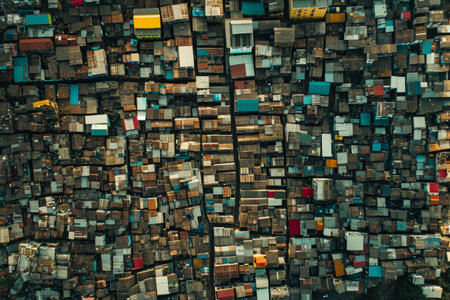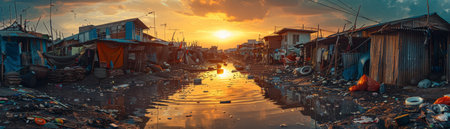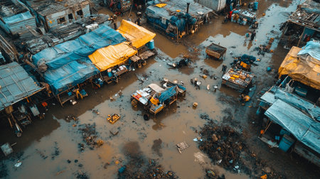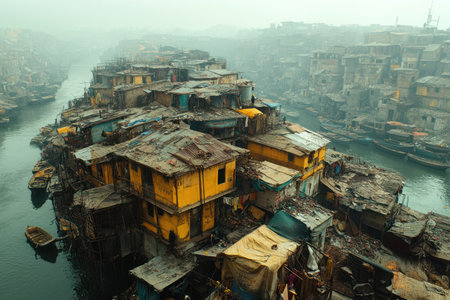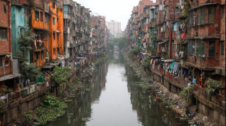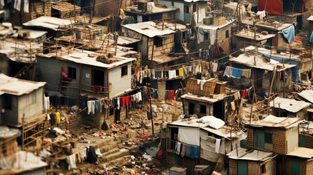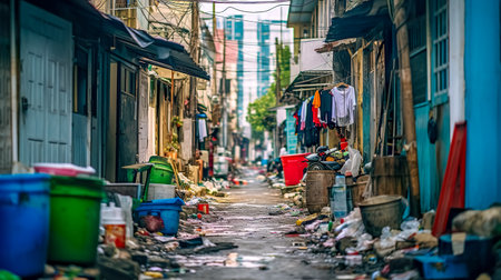 This powerful image captures the harsh realities of urban slum conditions, showcasing waste, overcrowding, and environmental neglect in city landscapes.