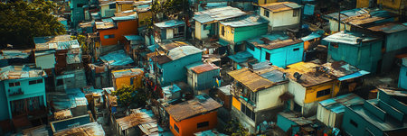 Overcrowded slum with dilapidated housing and blue rooftops.