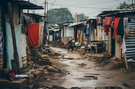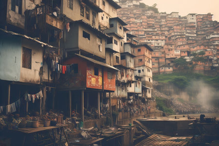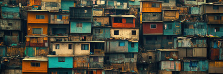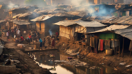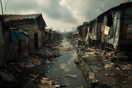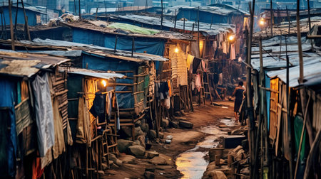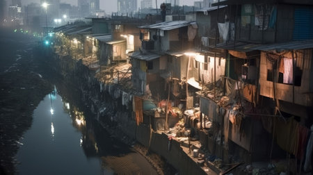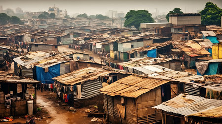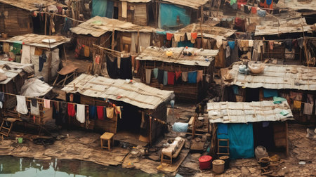 Makeshift shacks in a poverty stricken city slum. Generative AI