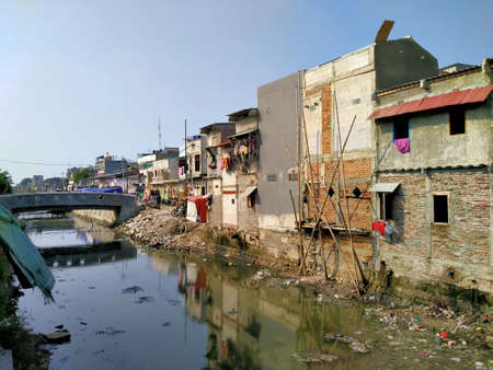 Tambora, Jakarta, Indonesia - (04-25-2021) : The atmosphere of a dirty and smelly slum building is on the side of the river