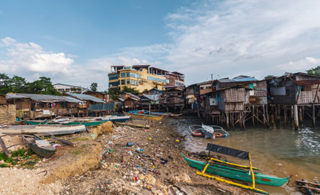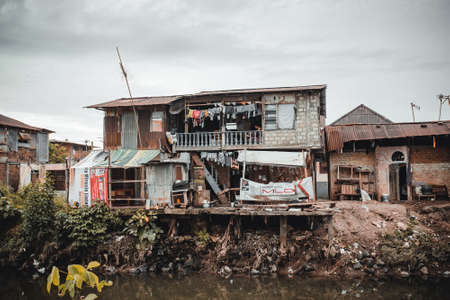 MANADO, NORTH SULAWESI, INDONESIA - AUGUST 3, 2015: View of a ghetto by a river with pollution, the poorest part of Manado city, on August 3, 2015 in Manado, North Sulawesi, Indonesia