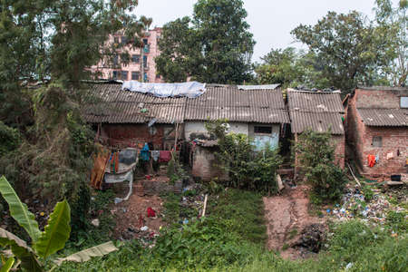 Easy residential homes with plastic waste and laundry drying in the slums of Bhubaneswar, India