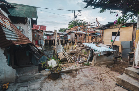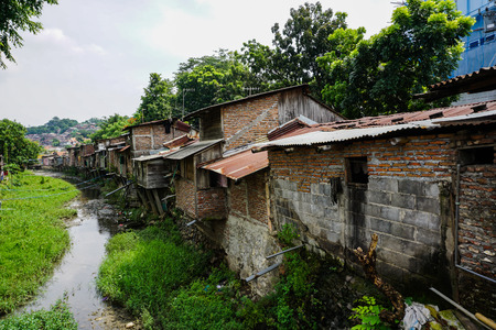 Poor area with slums and sewers in Indonesia. Poor asian city block