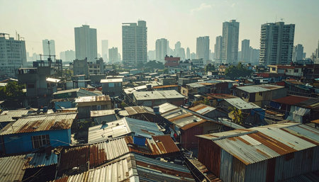 Luxurious villas stand alongside dilapidated shanties, highlighting stark social inequality in a vibrant urban landscape.
