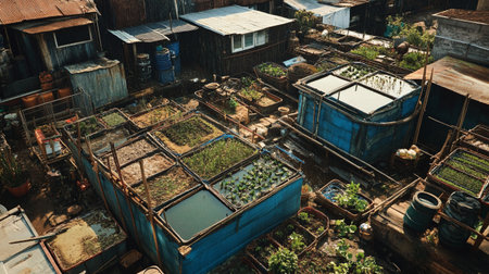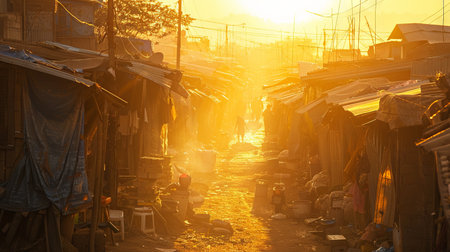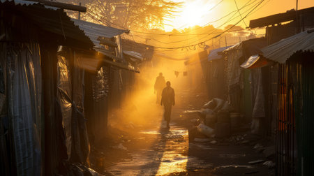Sunlight breaking through in a slum area, highlighting the textures and daily life in the neighborhood