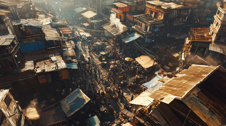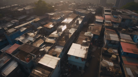 This image captures an aerial view of a sprawling urban slum at sunrise, highlighting the stark living conditions and shadows casting over various shanties.