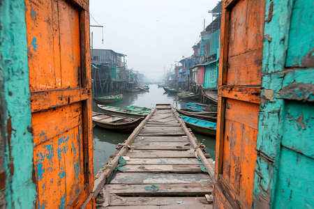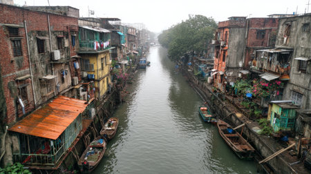 Boats navigating a polluted canal surrounded by precarious shacks in makoko slum, lagos, nigeria, highlighting the devastating impact of extreme poverty and environmental degradation. Generative ai