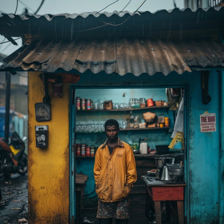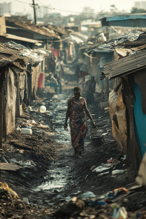 The little girl stands in the slums, surrounded by dilapidated buildings and debris, embodied innocence amid the harsh realities of urban living.