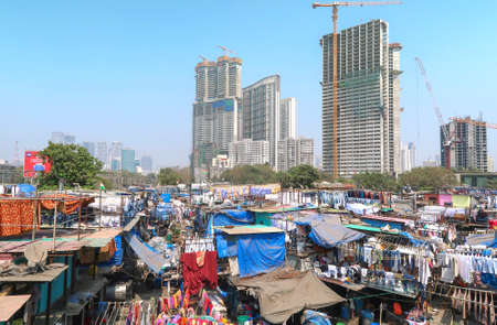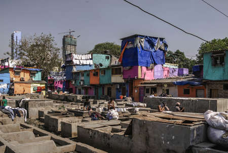 Mumbai, India - October 19, 2015 - Muslim washing spot Dhobi Ghat in front of Mumbai skyline