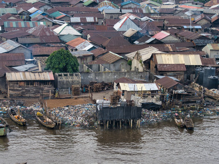 Panorama of african town on the riverside. Lagos, Nigeria, Africa