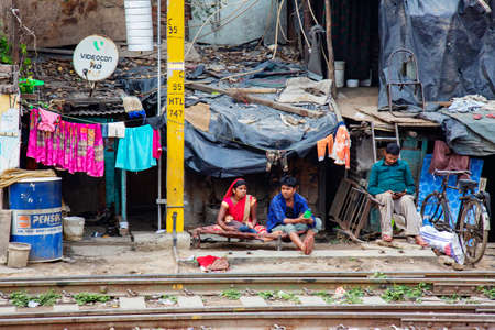 Mumbai, India - February 26, 2019: View of garbage slums poor area near Suburban Railway. Dharavi Slum at Mumbai