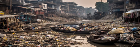 Extremely polluted banks of river with boats and huge amount of garbage. AI generative illustration.