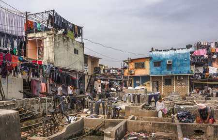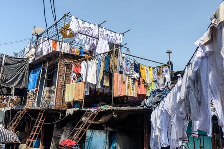 Dhobi Ghat is an open air laundromat lavoir in Mumbai, India with laundry drying on ropes