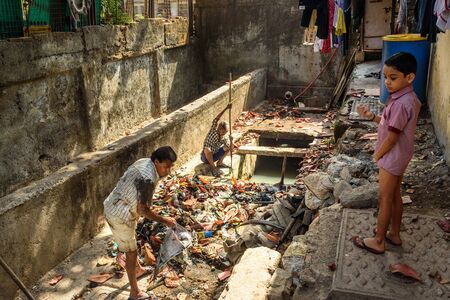 Mumbai, India - February 26, 2019: Indian man cleaning gutter in Dharavi Slum at Mumbai