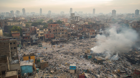 Urban landscape shows pollution and debris in a densely populated area during early morning hours in a major city