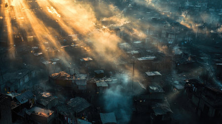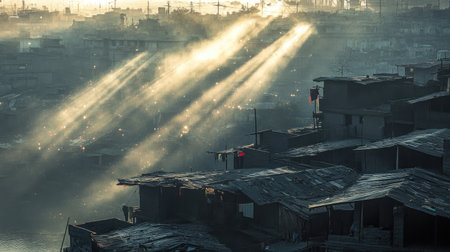 This evocative image captures early morning light piercing through mist over an urban slum, highlighting the stark realities of city life, poverty, and resilience.