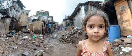 A young girl with a sad expression stands amid the rough terrain of the slums, surrounded by makeshift homes and debris, reflecting the harsh realities of her life.