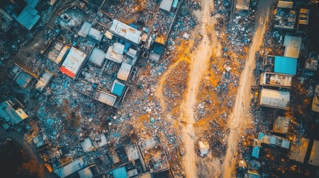 This aerial image captures a densely packed urban area filled with varied waste piles and cluttered containers, highlighting the critical issue of waste management in city environments.