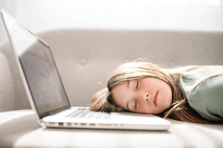 Beautiful young woman sleeping with head on laptop while lying on the couch at home