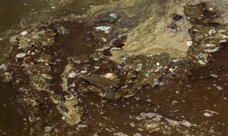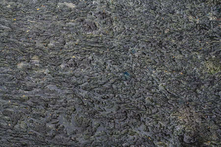 Dirty wave with old dirty algae. Dirty seaweed sea surf lines in seaport. Dirty sea, environmental problem of environmental pollution. Algae in sea wave. Toxic decaying algae. Ecological catastrophy