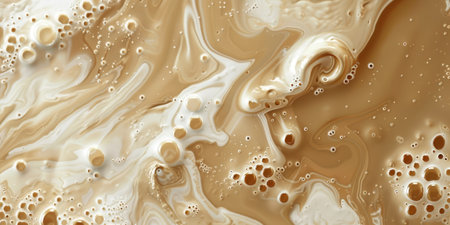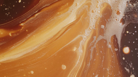Close up abstract brown caramel shapes latte art in coffee. Liquid texture coffee background macro. Cappuccino and milk foam close up view. High quality photo