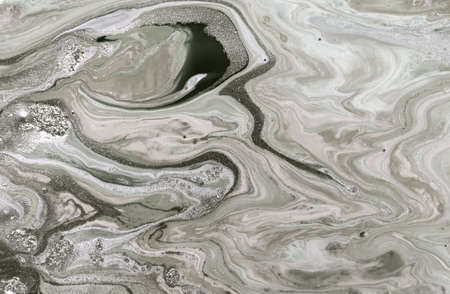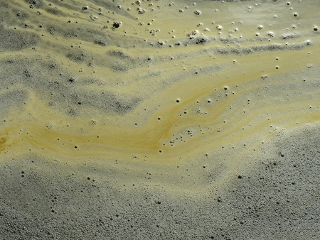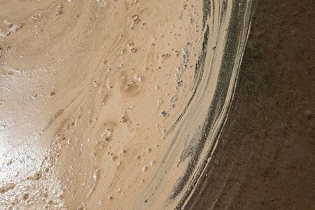 Foamy muddy water of yellowish-brown color. Muddy sea water, puddle, dirty surface Top view.
