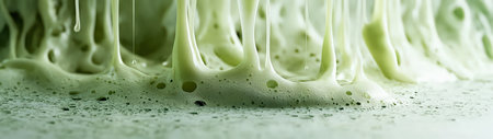 Captivating close-up of a green creamy substance dripping onto a surface. The image showcases vibrant textures, shiny bubbles, and a smooth, appealing appearance, perfect for culinary or artistic themes.