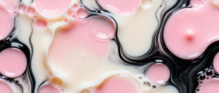 Abstract close up of pink, white, and black liquid bubbles blending in fluid organic patterns and marble textures.