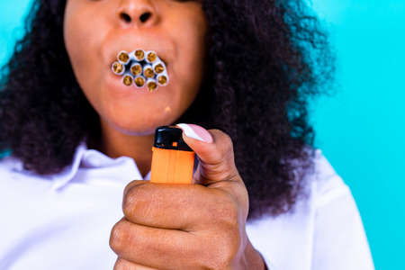afro woman winning with addicted nicotine problems, stop smoking studio blue background