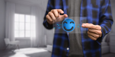 Close-up of a hand holding a wooden block with a smiley face, representing positive customer experiences and satisfaction in service.
