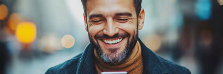 A man enjoys his time outdoors, smiling widely as he engages with his smartphone amidst a bustling city setting.