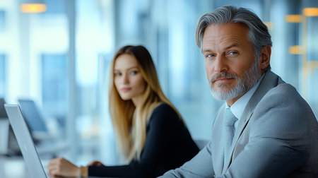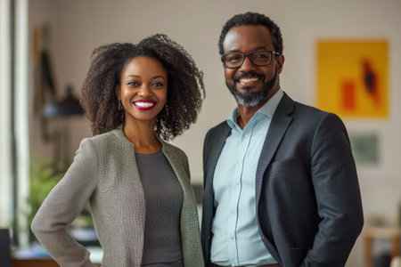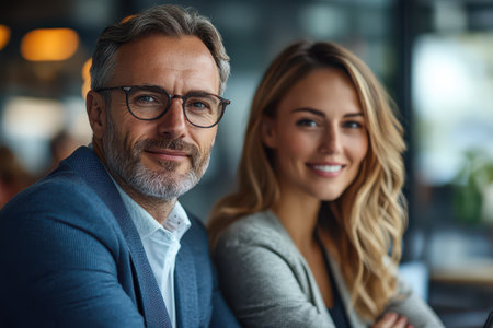 A professional male and female duo exuding confidence in a modern business environment, symbolizing diversity and effective leadership in the workplace.