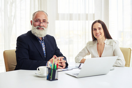 Portrait of smiling young businesswoman and senior man with beard in meeting