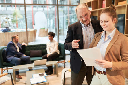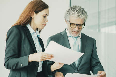 Professional partners discussing project and holding papers in conference room. Successful concentrated grey-haired entrepreneur talking, standing and reading. Business and management concept